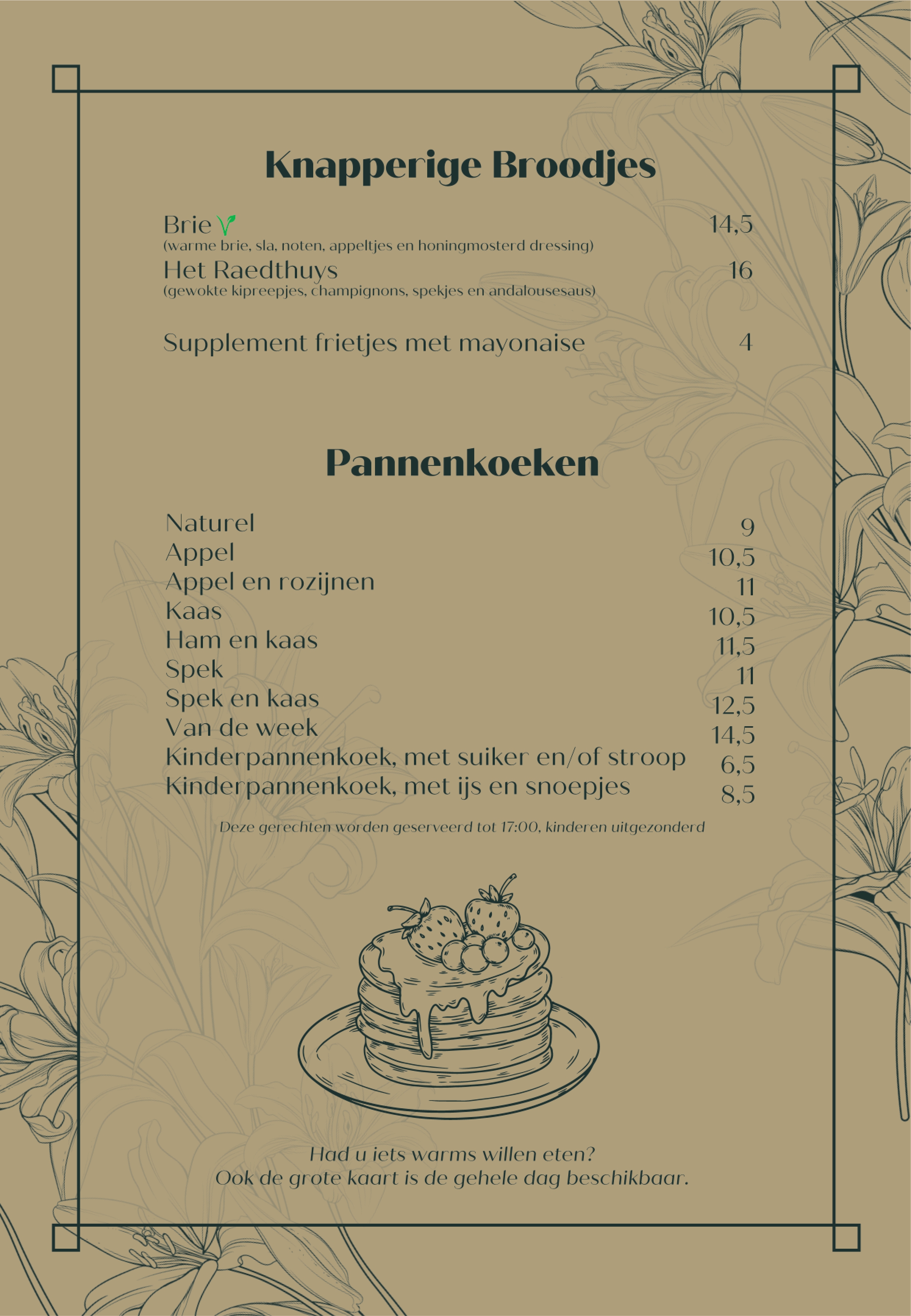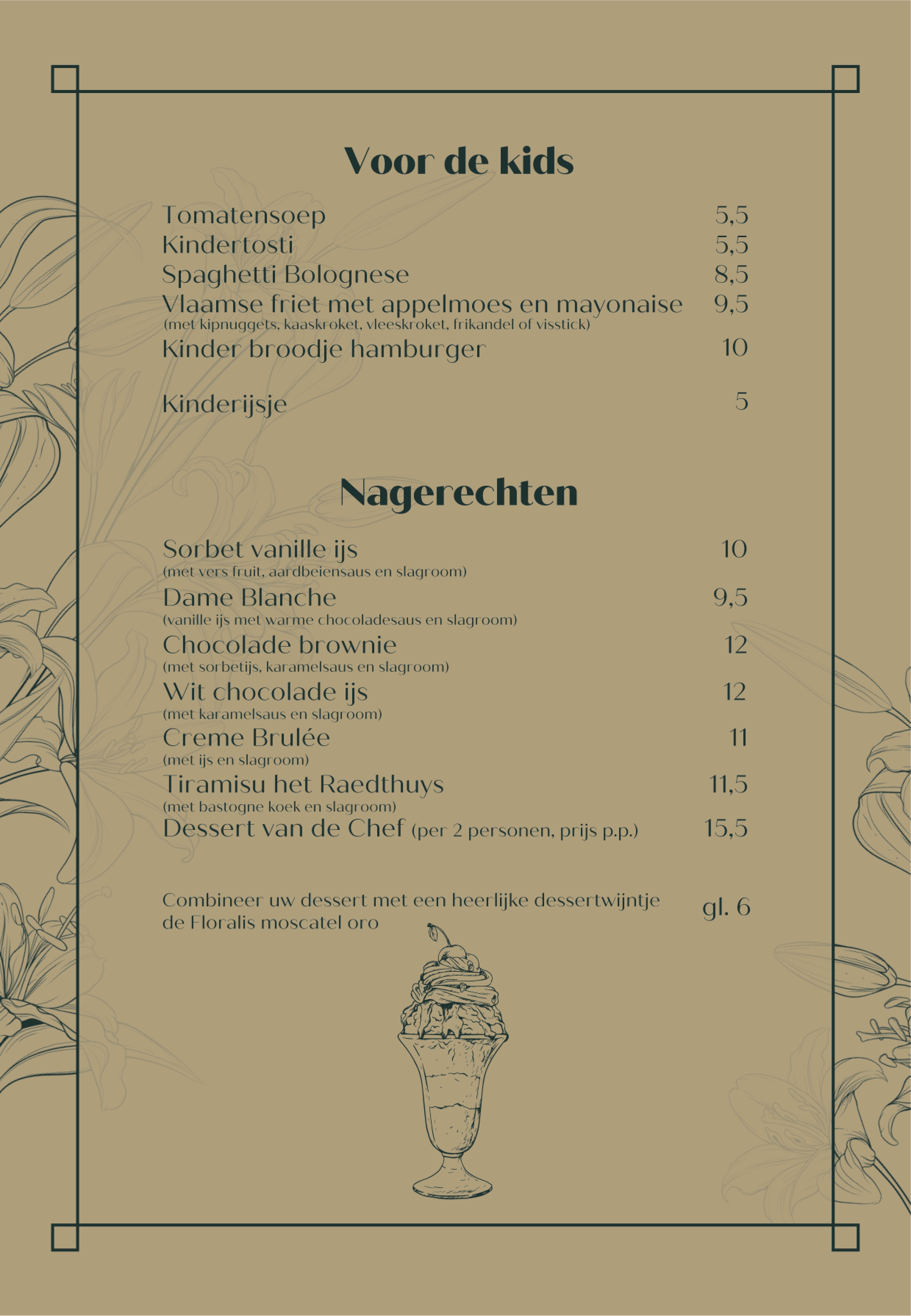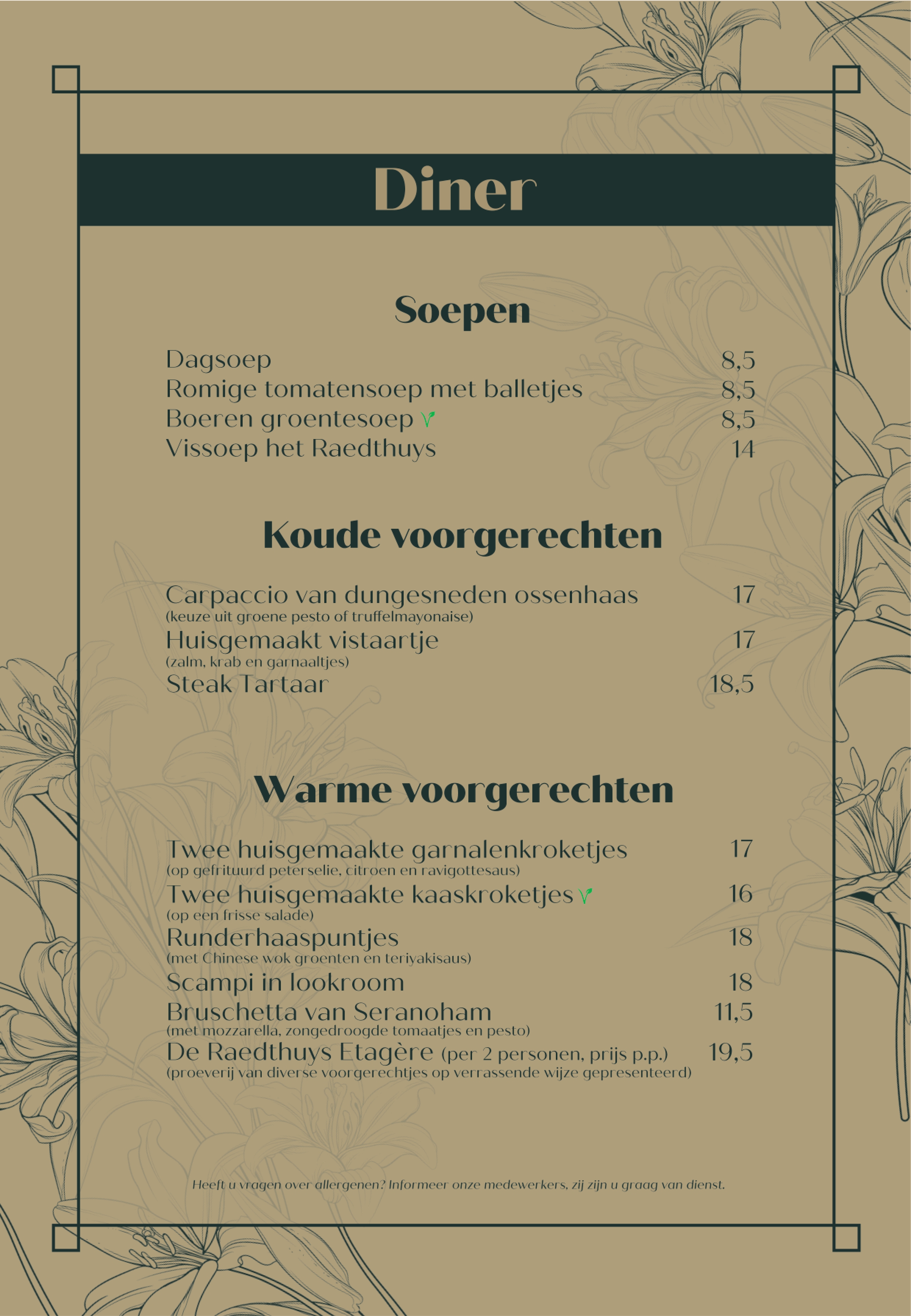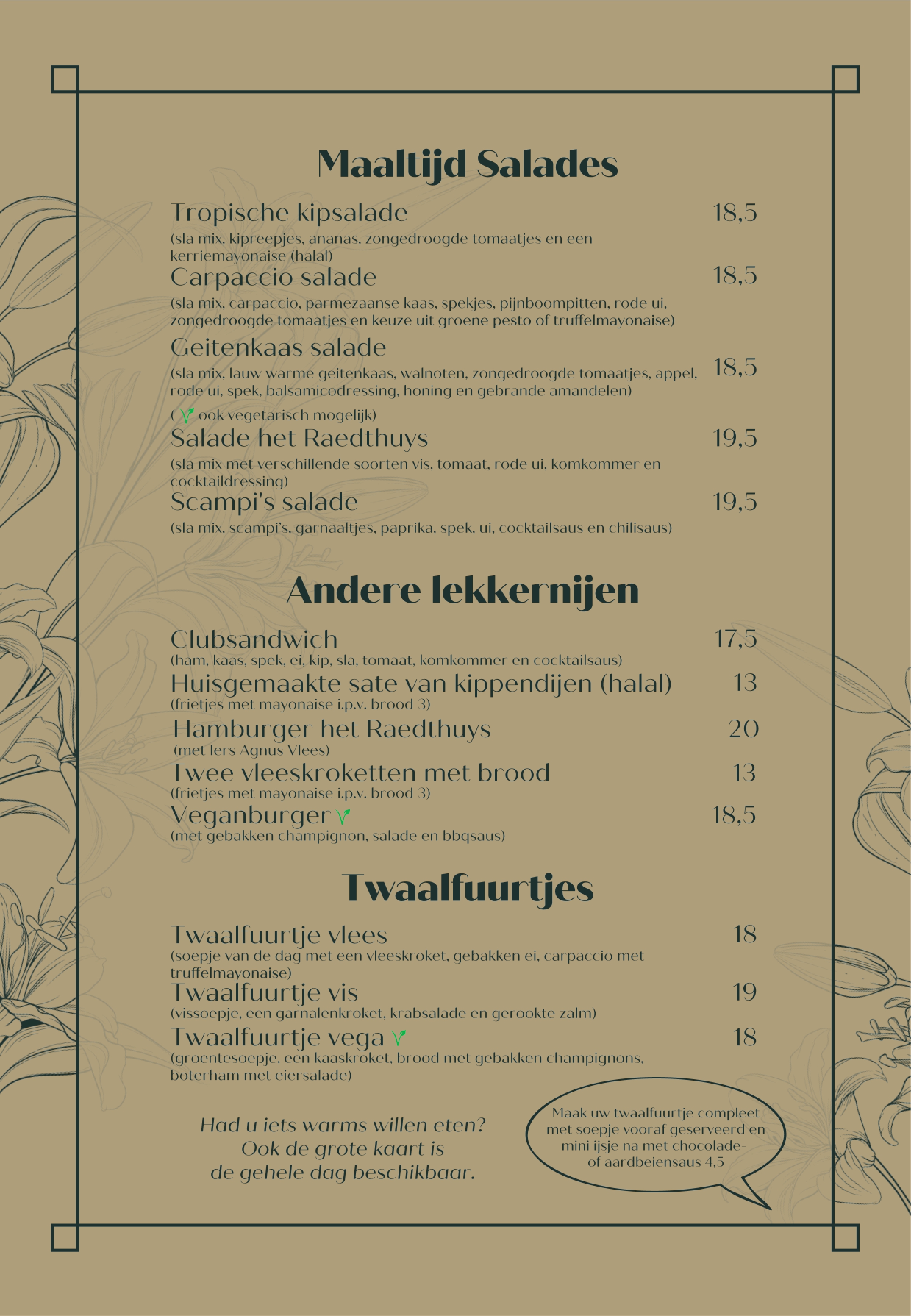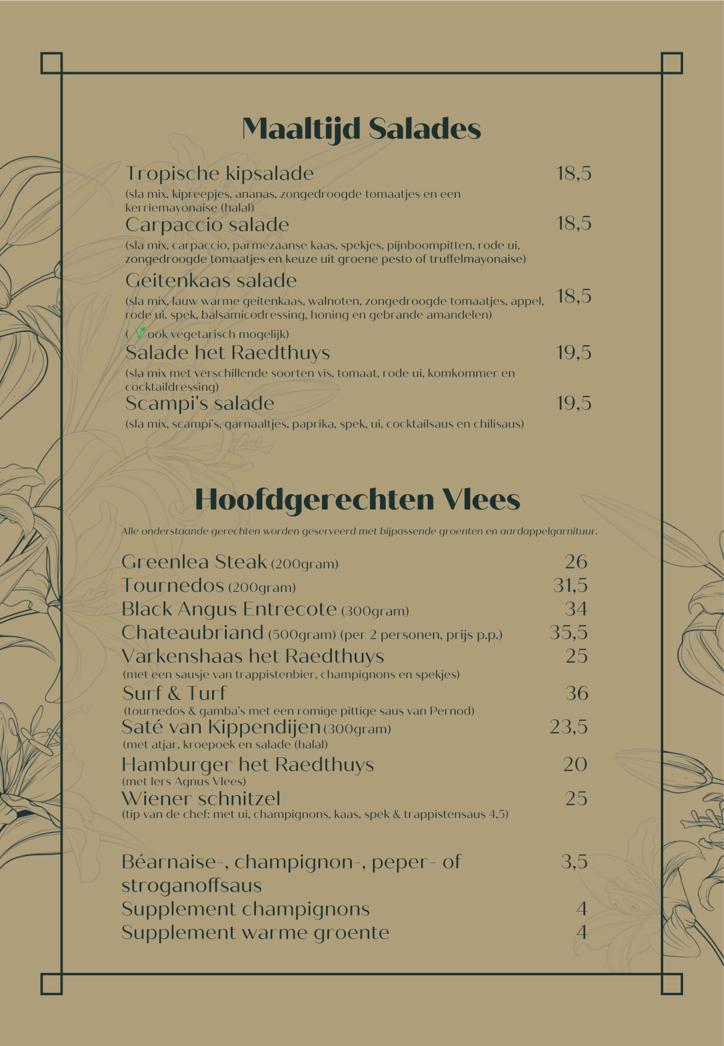 Op onze digitale menukaart Het Raedthuys kunt u alvast een kijkje nemen in wat het restaurant te bieden heeft alvorens een tafel te reserveren.